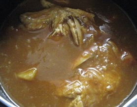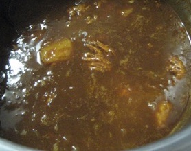 すべてを良く炒めてからお水を入れ香り付けにローリエも入れて圧力鍋で6分間。